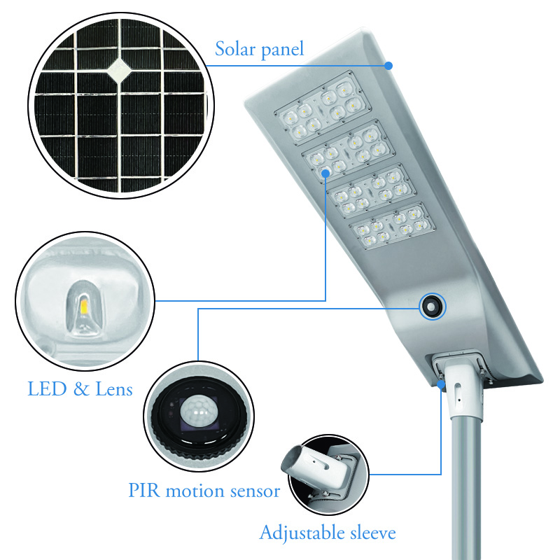 - 1. Integrated design, making full use of solar resources, simple, stylish, light, and extremely convenient to install. The integrated solar streetlight does not need to be pulled,and two or three people can install one in ten minutes. It provides a variety of installation methods. The lamp post is made from local materials.Iron pillars, wood, bamboo, plastic, etc., low cost.